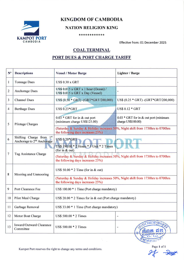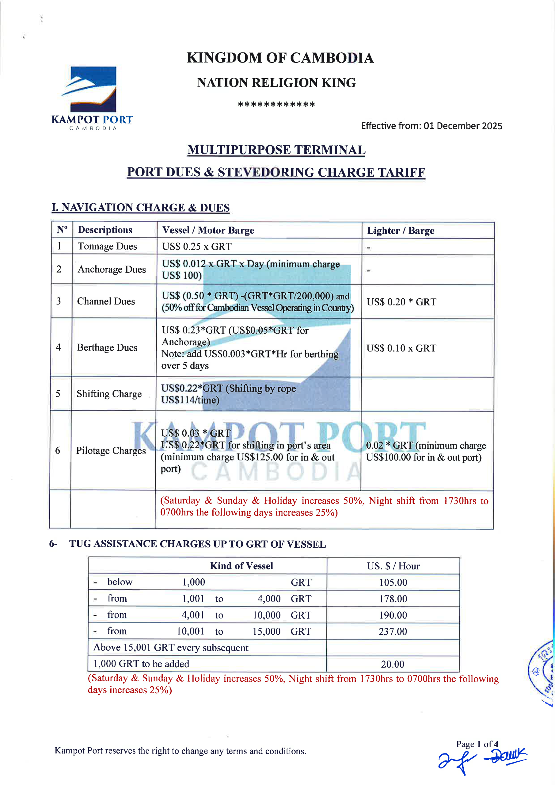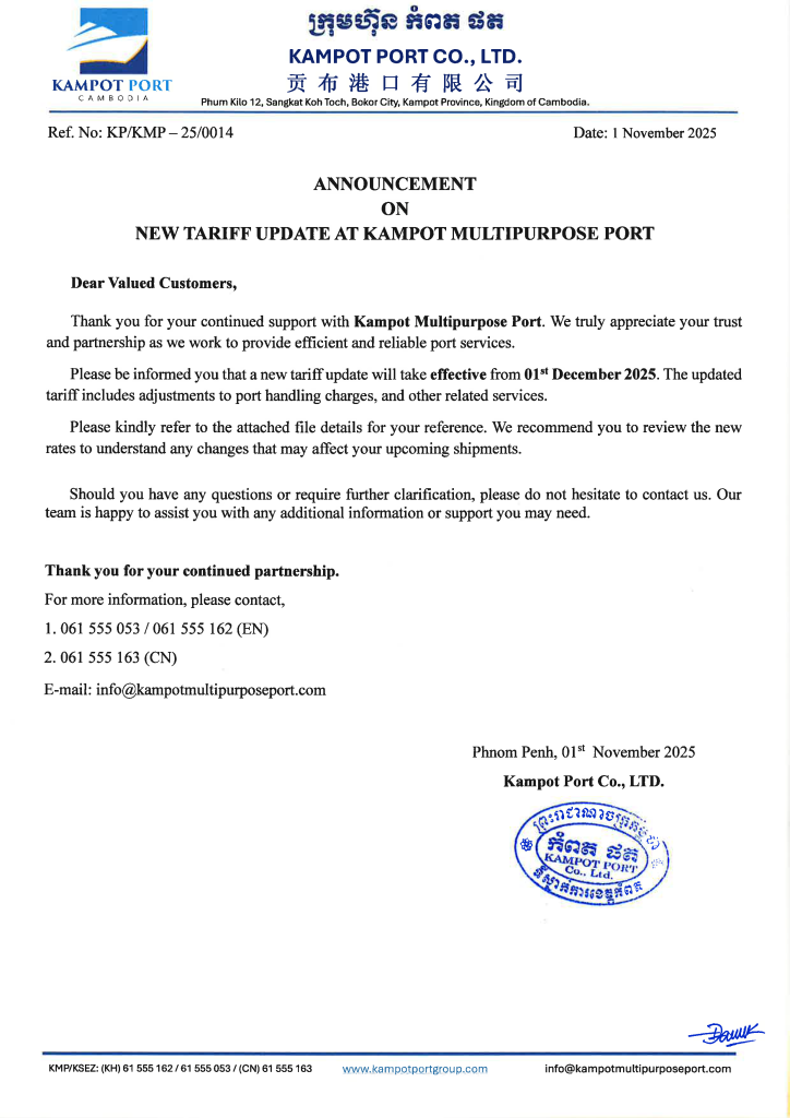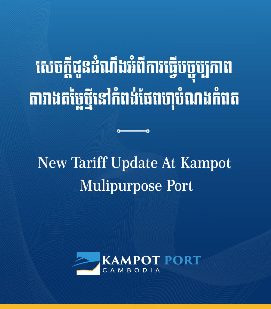 ANNOUCEMENT NEW TARIFF UPDATE AT KAMPOT MULTIPURPOSE PORT