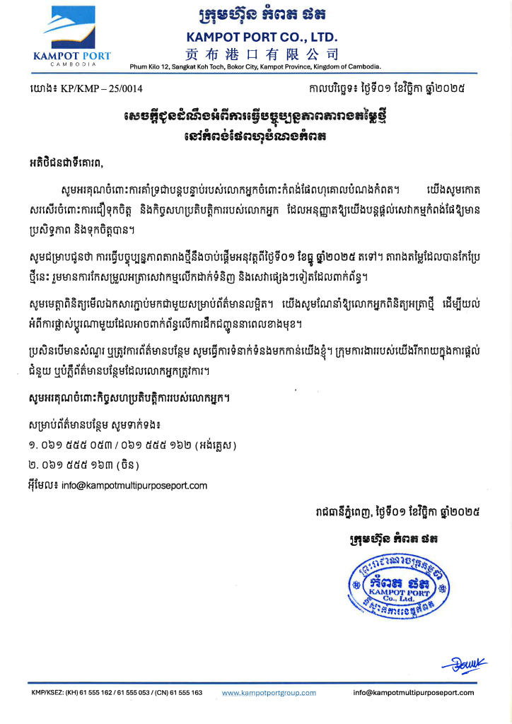 សេចក្តីជូនដំណឹងអំពីការធ្វើបច្ចុប្បភាពតារាងតម្លៃថ្មីនៅកំពង់ផែពហុបំណងកំពត