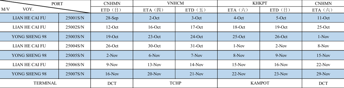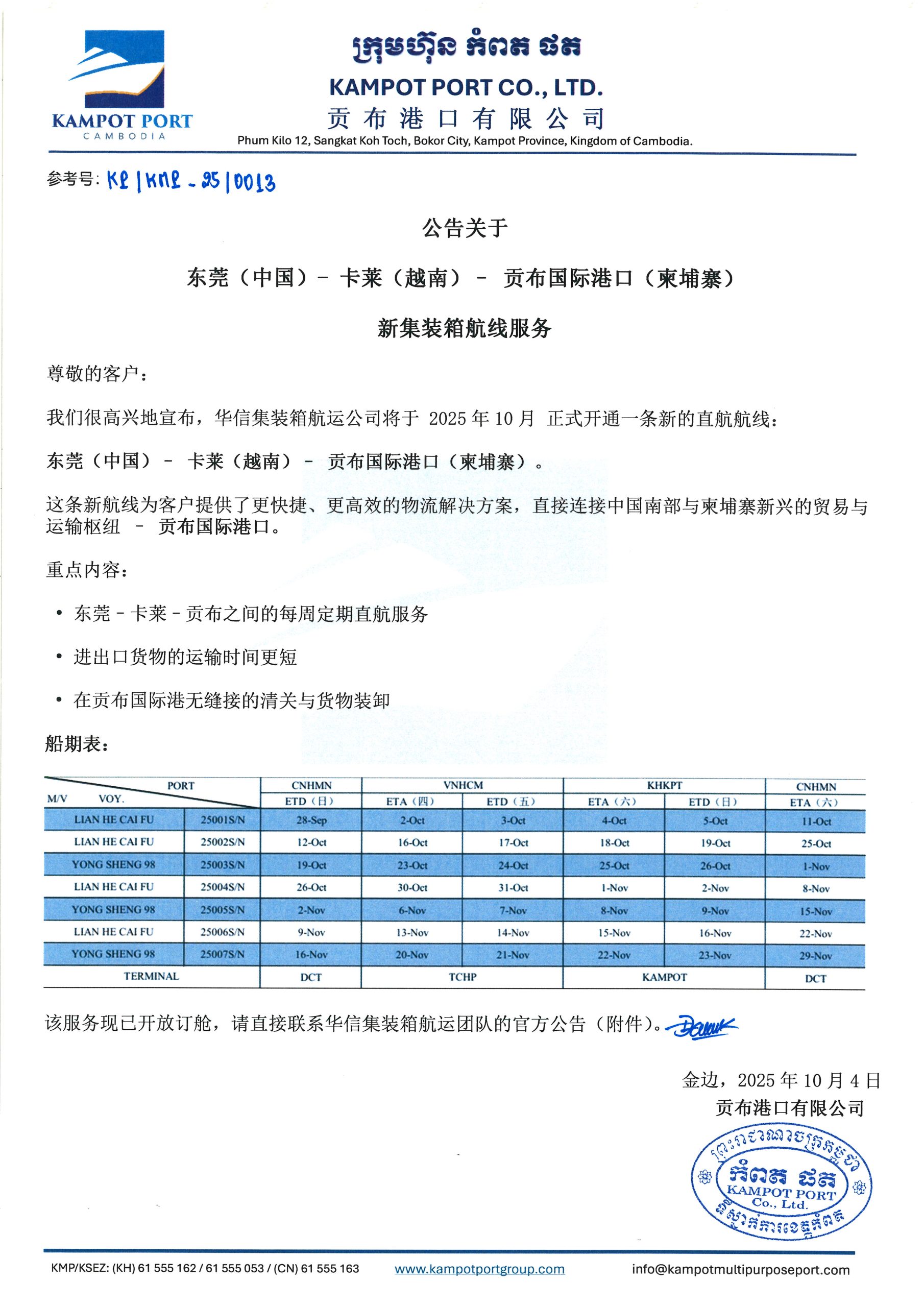 公告关于 东莞(中国)- 卡莱(越南)– 贡布国际港口(柬埔寨)新集装箱航线服务